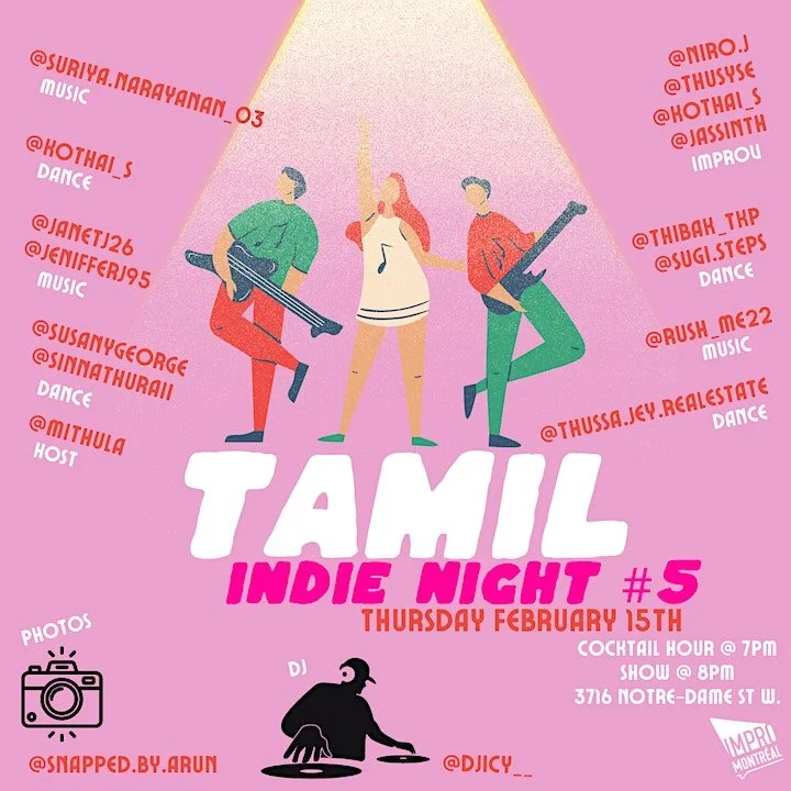 We are back! For volume #5, it will be a competition edition again! Come check out local Tamil talents showcasing various art forms of stand up comedy, improv, live music, cultural & contemporary dances. Acts will be competing for audience votes. The top act of the night will be crowned the Tamil Indie Night champion and receive a cash prize! There will be also DJICY spinning some tracks. Come grab a drink and support indie talent!