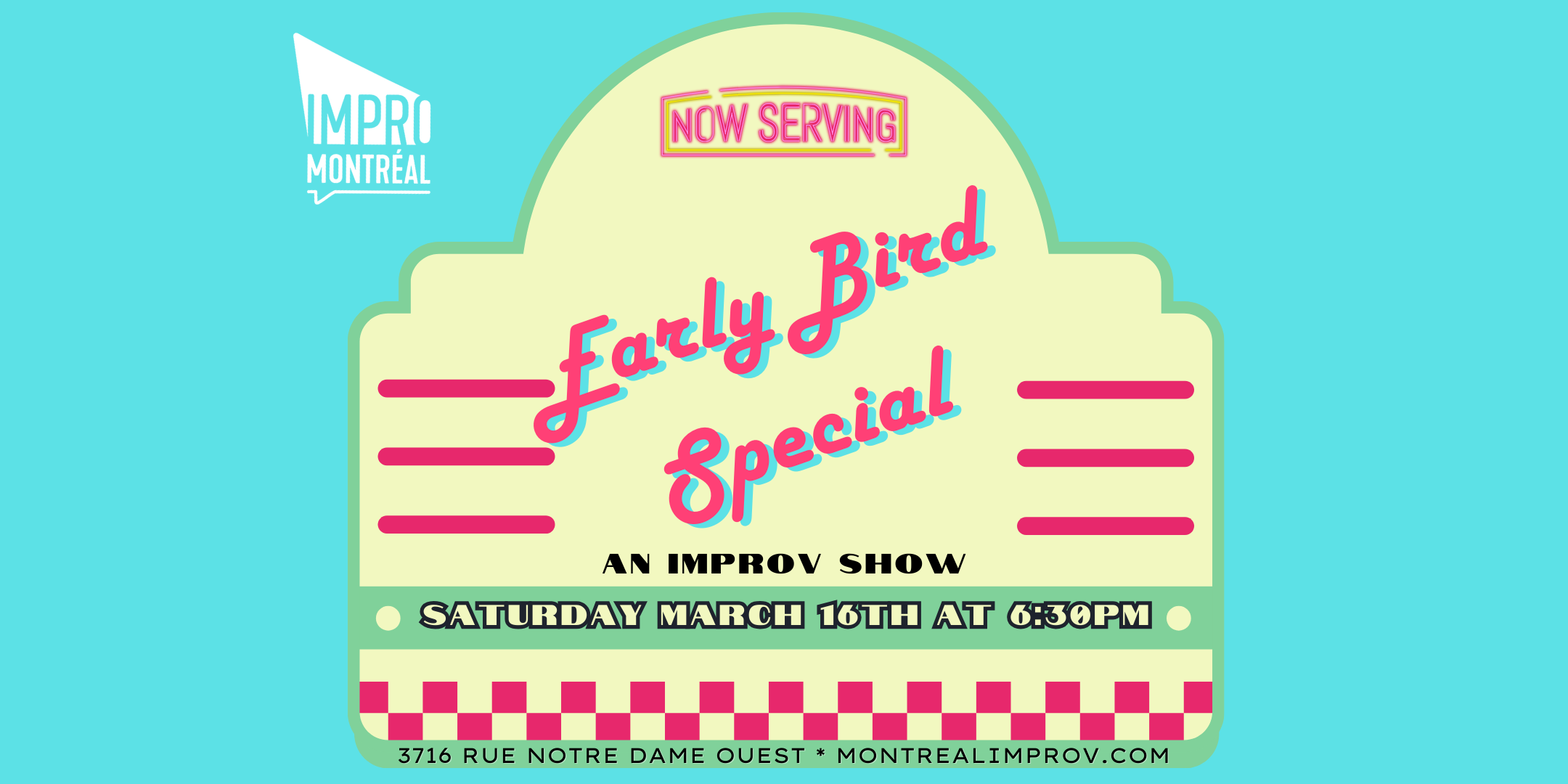 Come on out for Early Bird Special, an improv show that will give you a full plate laughs with some joy on the side! Get your fill seeing some fabulous longform troupes deliver the giggles on Saturday March 16th at 6:30pm!