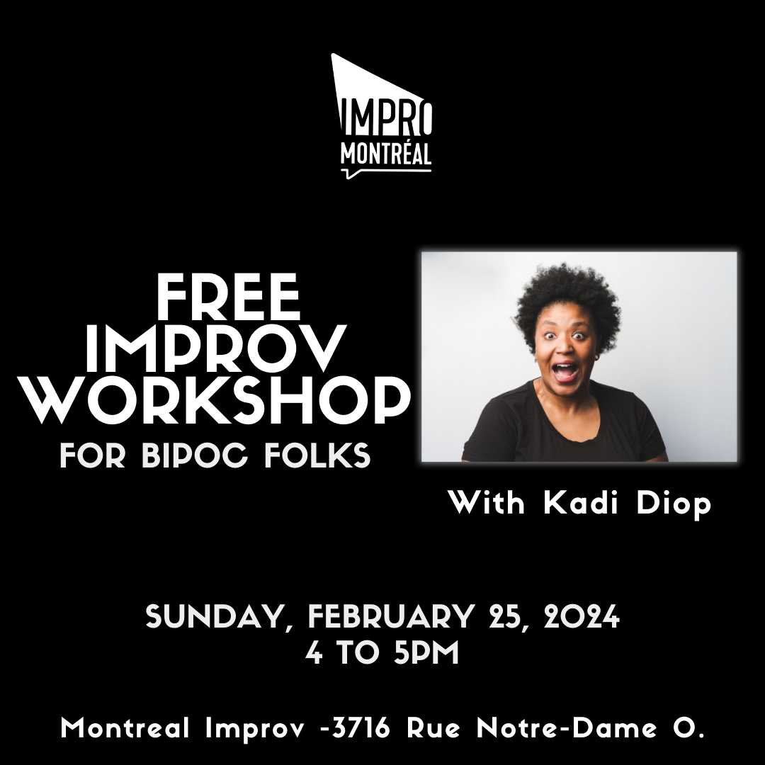 Want an opportunity to try improv for the first time? A chance to play? Join us on Sunday February 25th at Montreal Improv, for a Free Improv Workshop for BIPOC folks from 4 to 5pm and led by Kadi Diop!