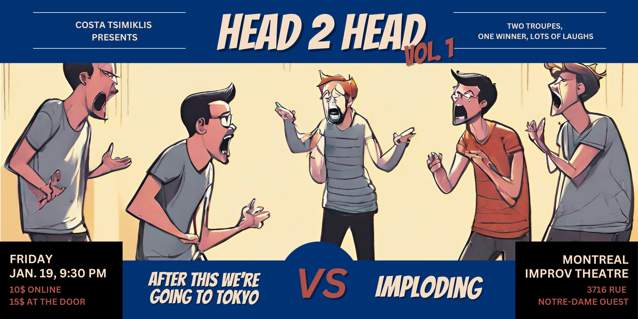 Assistez à l'affrontement de deux des meilleures équipes d'improvisation de Montréal dans Head 2 Head - un affrontement palpitant d'esprit et de spontanéité ! Vous allez rire ! Vous pleurerez (des larmes de joie) ! D'une durée de 25 minutes chacune, ces troupes talentueuses déploieront leurs prouesses d'improvisation afin de conquérir le public. Ce sont les spectateurs qui ont le pouvoir et qui votent pour le meilleur numéro. Le triomphe peut être synonyme de célébrité, de gloire, d'approbation des dieux de l'improvisation et d'un (petit) prix en espèces !