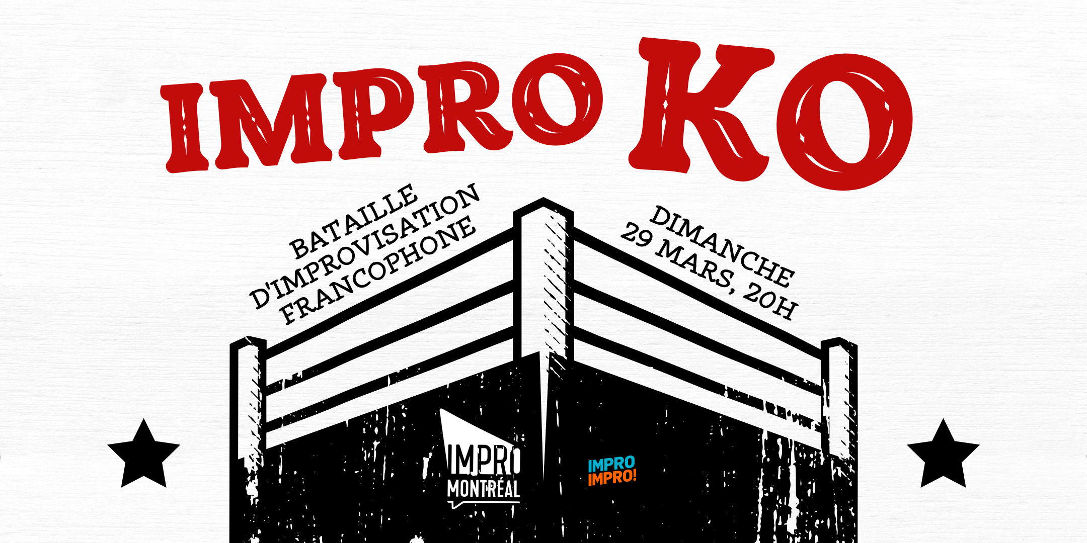 Dans IMPRO KO, les improvisateur·rices s’affrontent à travers une série de jeux et de scènes improvisées. Créativité, rapidité et audace seront essentielles pour conquérir le public, car c’est l’applaudimètre qui déterminera le grand gagnant de la soirée!