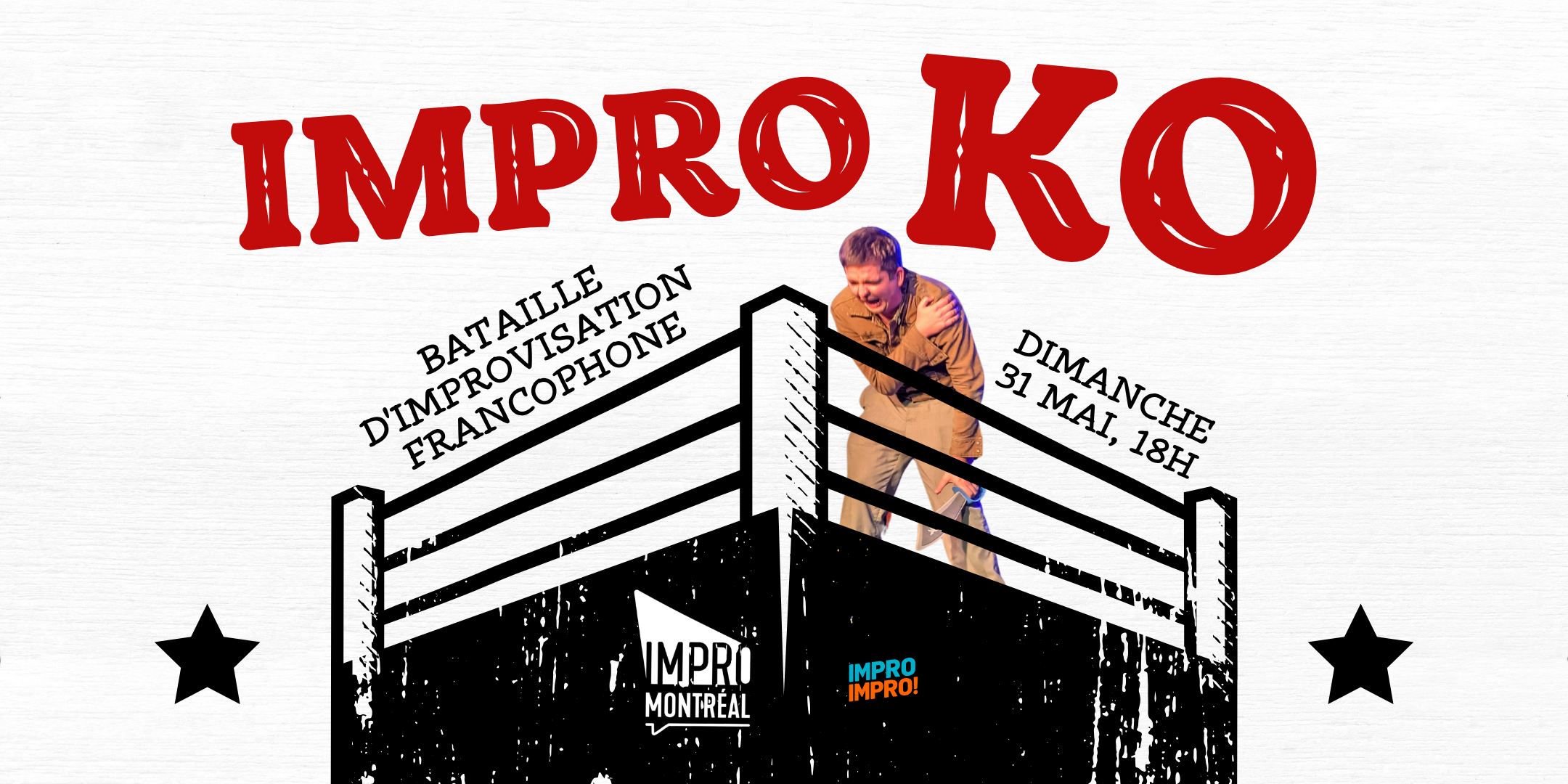 Dans IMPRO KO, les improvisateur·rices s’affrontent à travers une série de jeux et de scènes improvisées. Créativité, rapidité et audace seront essentielles pour conquérir le public, car c’est l’applaudimètre qui déterminera le grand gagnant de la soirée!